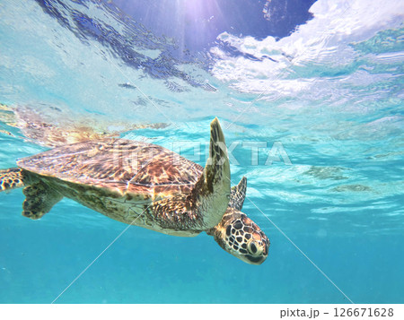 青い海を泳ぐウミガメと海面からのぞく青空