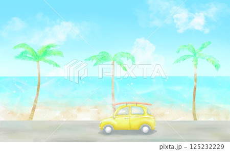 ヤシの木が並ぶ南国の海辺をドライブする黄色い車。青い海と空がまぶしい夏の爽やかなイラスト。