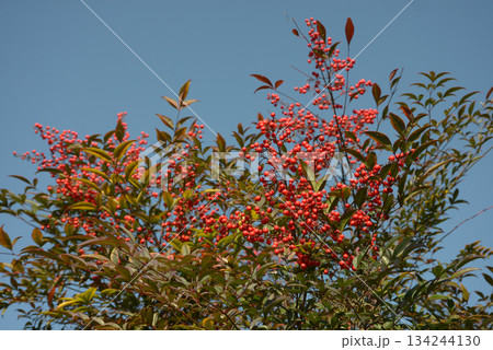 青空と赤く熟した南天の実の風景