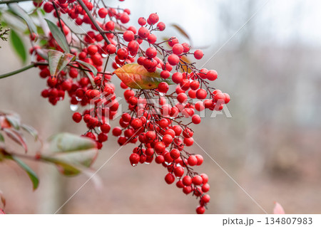 南天の赤い実と緑の葉 冬イメージ