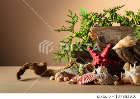 Abstract nature scene with a composition of seashell, starfish, green branches, and snags.