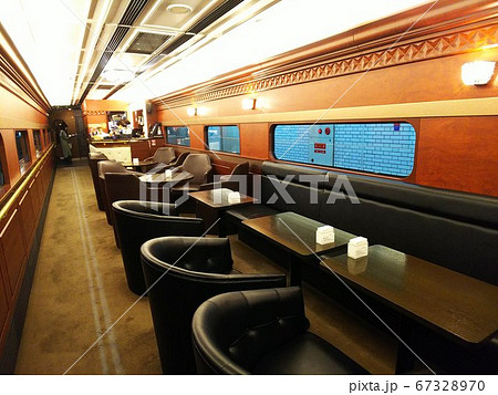 吉野の桜で有名な近鉄特急 青の交響曲(シンフォニー)の食堂車の重厚な茶色系のインテリア