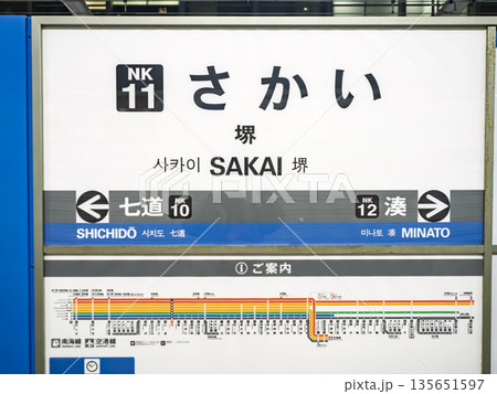 多言語表記で見やすい南海本線「堺駅」の駅名標と路線図案内