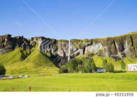 アイスランドの南部にある滝、スコゥガフォスの8月の夕方の風景です。
