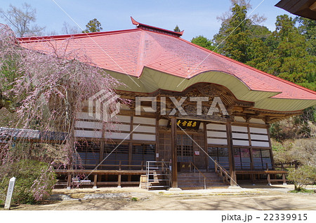 信州 安曇野の古刹 泉福寺 木曽義仲の創建 山桃の花と本堂 俯瞰 横