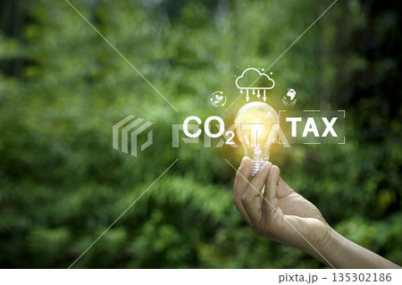Hand holding light bulb with CO2 tax concept, symbolizing carbon regulation, clean energy, and sustainability for a greener future, symbolizing climate policy and green economy regulation.
