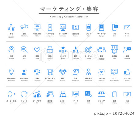 マーケティング・集客のシンプルなアイコンのセット ビジネス 宣伝 広告 SNS 戦略 SEO 購入