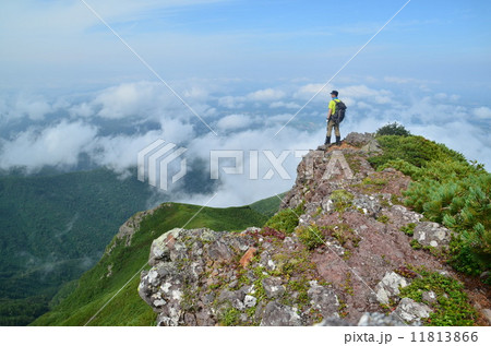 一切経山 登山者 女性 春