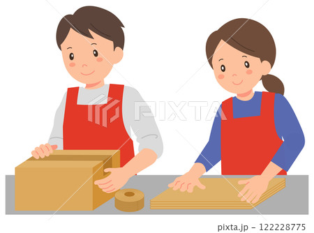 段ボールを梱包するエプロン姿の男女