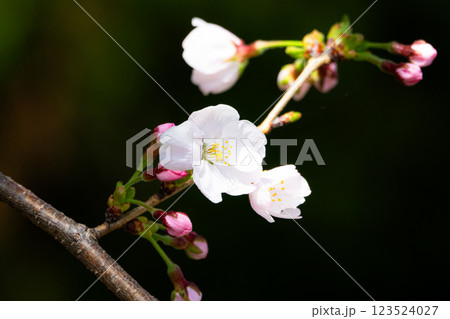 春の陽気に誘われて蕾から咲き始めたピンクの桜の花