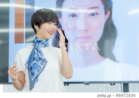 モニターの前でメイクレッスンをする女性講師 就活メイク ビジネスセミナー