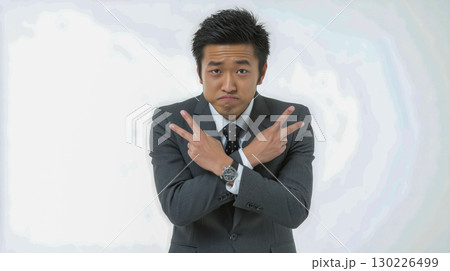 白背景スタジオ撮影の若いビジネスマン、スーツ姿がXポーズで拒否ジェスチャー、困惑した表情・ストップサ