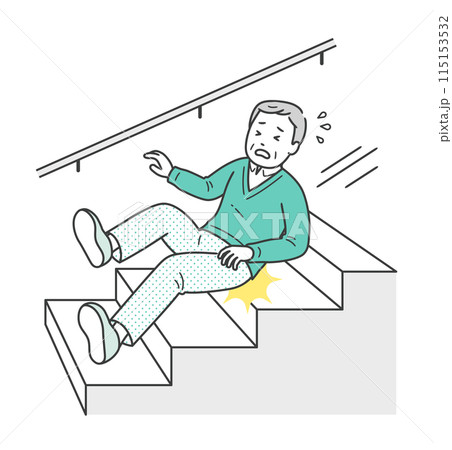 階段で足を滑らせて転落し尻もちをつく高齢男性