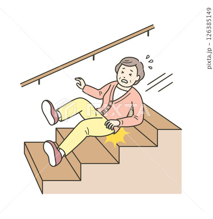 階段で足を滑らせて転落し尻もちをつく高齢女性