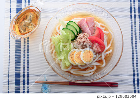 夏にぴったり涼しげなガラス鉢のサラダうどん 野菜と卵とハムを彩りよく盛り付けた冷製麺