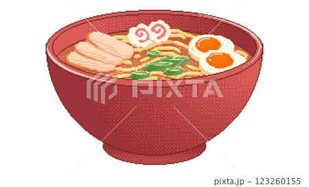 Pixel art Japanese ramen soup with meat slices, eggs and narutomaki isolated on white background. 16-bit retro video game style vector illustration.