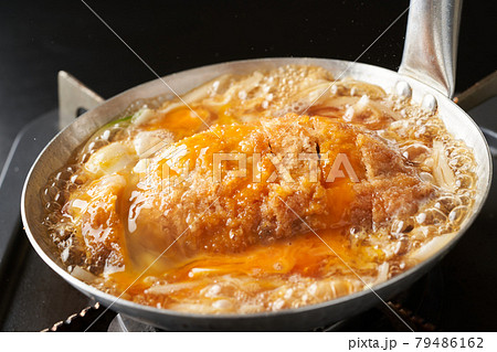 IHクッキングヒーターに対応している親子鍋でカツと玉ねぎを煮て卵でとじる調理シーン