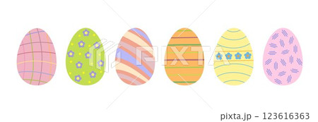 Easter egg collection colorful decorated in festive tones holiday symbol, flat style hand drawn vector illustration for spring celebration time decor, greeting cards, invitations, banners, web design