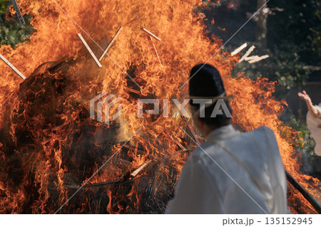 八幡のはちまんさんで実施される立ち上る炎の焼納神事を撮影