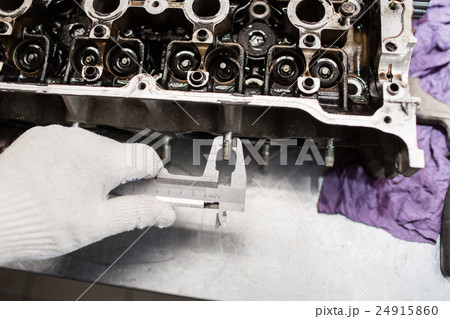 Mechanic, using a calipher, to check the thickness