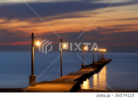 千葉県 原岡海岸 富士山と電球の灯る桟橋