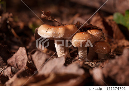 Fox mushrooms from the middle of an autumn leaf. Armillaria ostoyae.