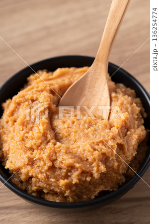 Scooping traditional Japanese miso paste from a black bowl with a wooden spoon