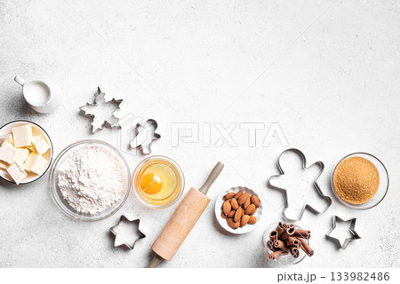 Christmas baking background with baking ingredients and cookie cutters
