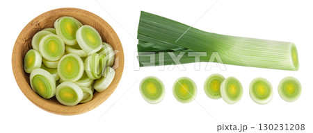 sliced Leek vegetable in wooden bowl isolated on white background with full depth of field