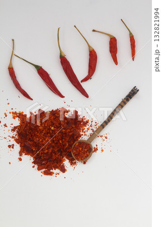 red dried crushed hot chili peppers and chili flakes or powder isolated on white background
