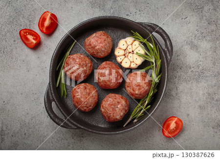 Raw meatballs with garlic and rosemary in cast iron pan on gray concrete background
