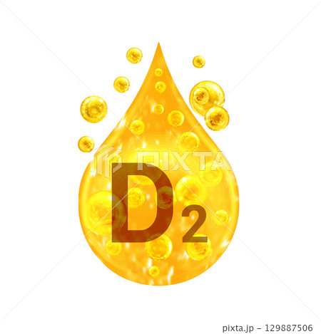 Vitamin D2. Images golden drop and balls with oxygen bubbles. Health concept. Isolated
