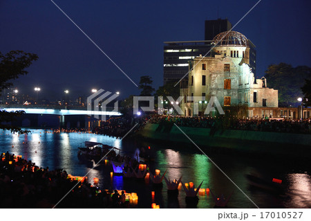 広島8月6日、原爆惨禍の日です。原爆ドームと元安橋付近の風景です。慰霊の灯篭流しが行われています。