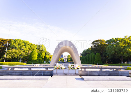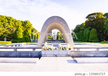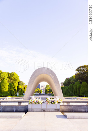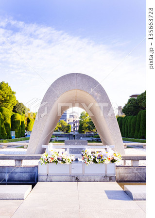 平和記念公園の明るい雰囲気の風景です。原爆死没者慰霊碑が見えます。広島県