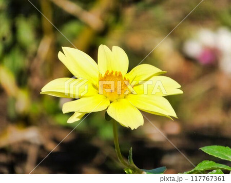 調布市深大寺元町の植物園に黄色いダリア(ひだまり)の花