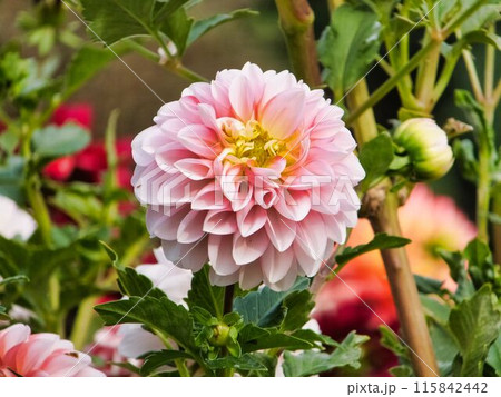 調布市の植物園に咲く淡いピンクと黄色のダリア(こころ)