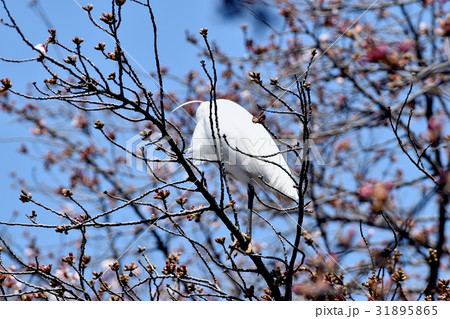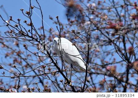 東京都三鷹の野鳥 仙川遊歩道に咲くサクラの木にとまるコサギ