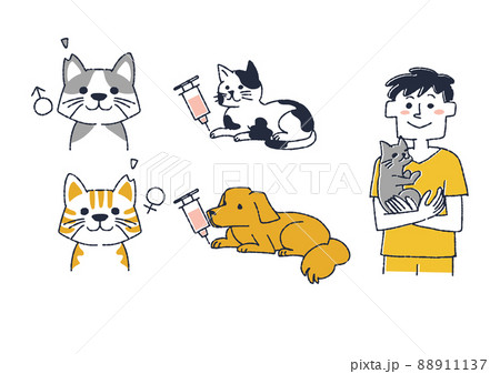 犬猫の保護活動のイラストセット コミカルな手書きの人物 ベクター、線画にカラー