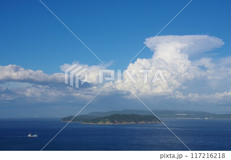 和歌山県友が島から見た友が島灯台とタンカーと淡路島の風景