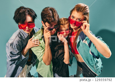Group of stylish youth posing in colorful streetwear and bold sunglasses on turquoise background