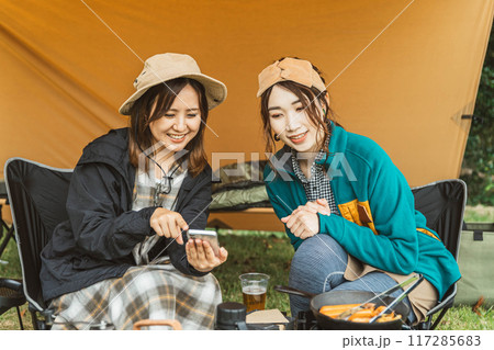 秋冬のキャンプ・アウトドアでスマホで検索するアジア人女性キャンパー