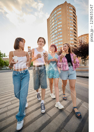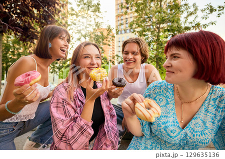 Smiling friends holding colorful donuts and posing cheerfully in summer city park