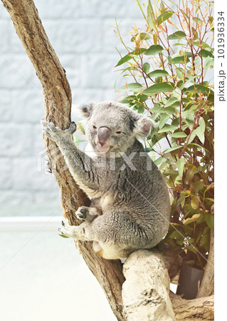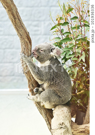 木に登っているコアラ 昼寝をするコアラ かわいい動物 コアラとユーカリの葉