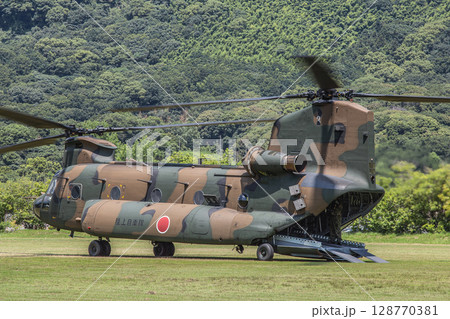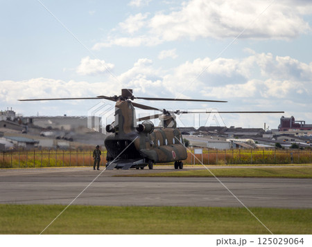 八尾駐屯地に駐機する大型輸送ヘリコプター