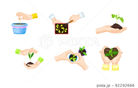 Hands holding soil with seedlings set. Gardening, ecology, environment protection vector illustration