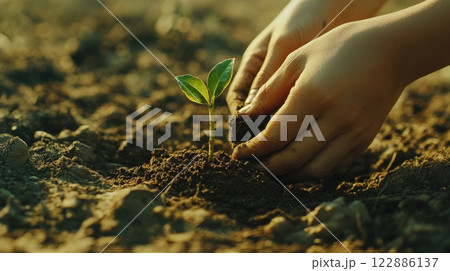 Weathered farmer's hands gently placing delicate green seedling into dark, nutrient rich earth, representing agricultural renewal and environmental stewardship