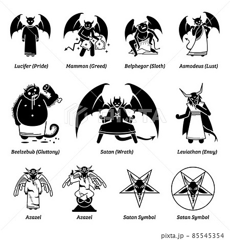 Seven deadly sins devils and Satan. Vector illustrations of Lucifer Pride, Mammon Greed, Belphegor Sloth, Asmodeus Lust, Beelzebub Gluttony, Satan Wrath, Leviathan Envy, Azazel, and scapegoat.
