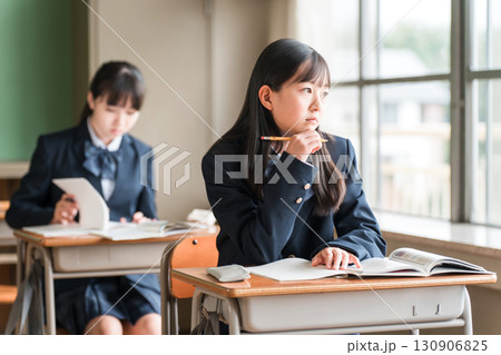 授業中にやる気がなさそうにまだの外を見る小学生,中学生,高校生の女子生徒(無気力,反抗期,不機嫌)
