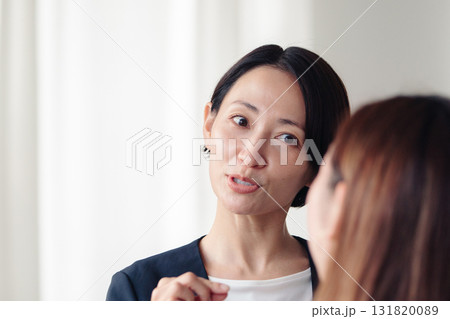 怒る女 カフェで年上の先輩に意見を言う若い女性