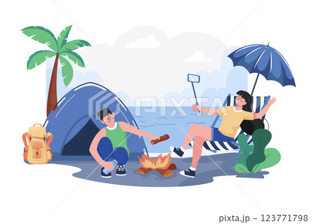 People Camping On The Beach Illustration concept. A flat illustration isolated on white background